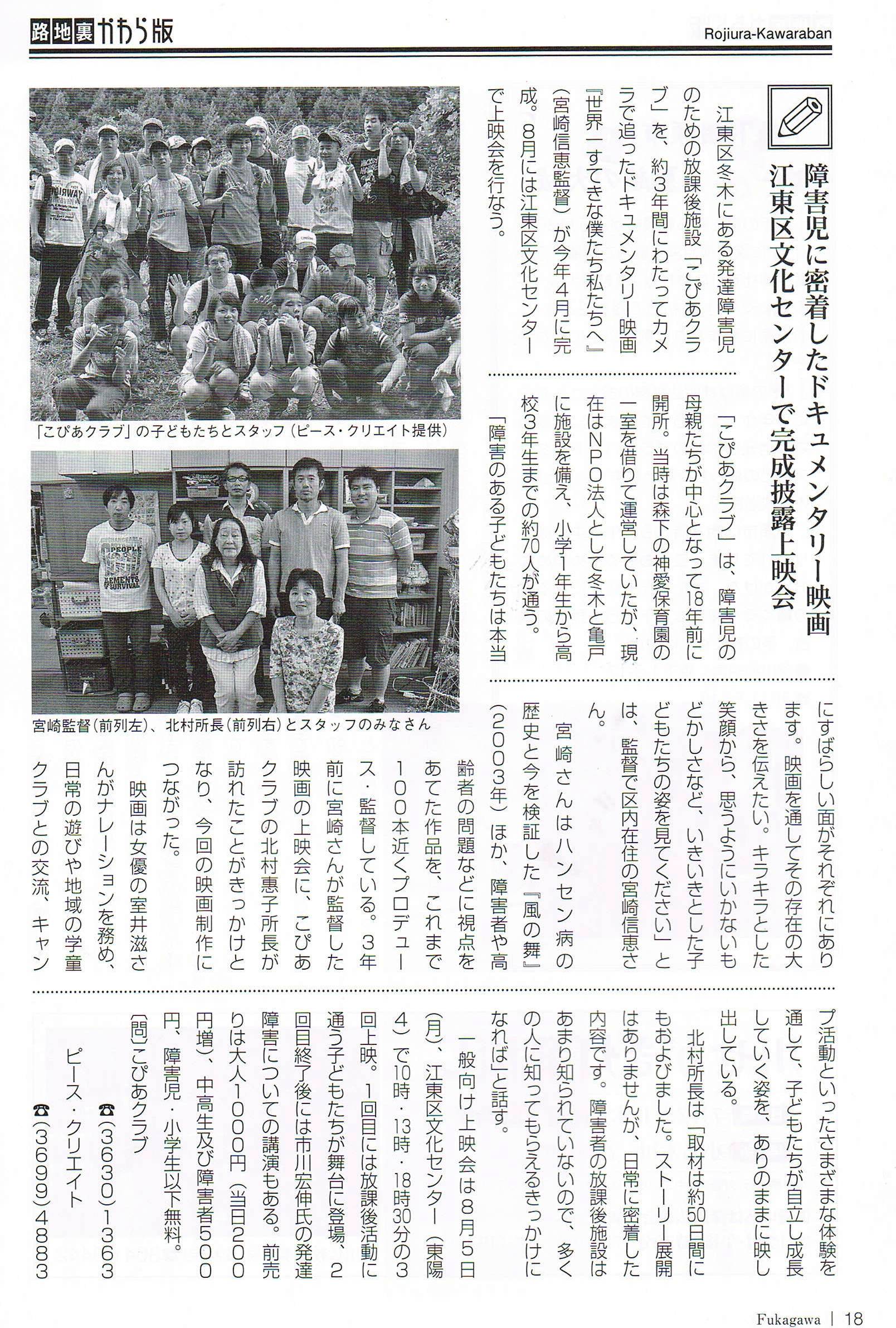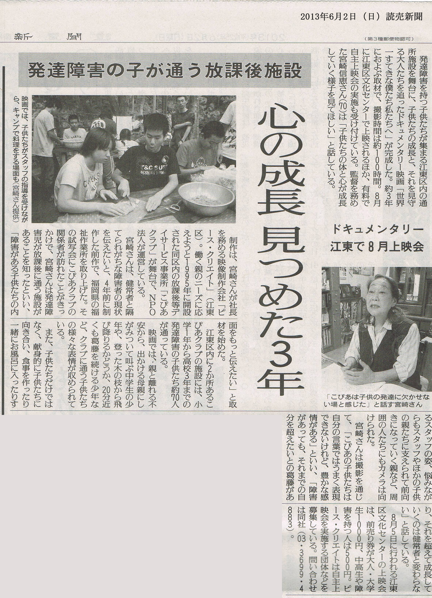 江東区男女共同参画推進センター(パルシティ江東)のレクホールで映画に出演してくださったこぴあの子どもたちや親御さん、スタッフの皆さんが、完成ほやほやの映画を観てくださいました。 3年に亘って彼らの日常を追った大作。 親御さんたちの感想はまだ伺っていませんが、画面に映る吾が子の姿に、いつもとは違った別の素敵な面を発見してくださったのではないかしら? 今日、出演者のみなさんに映画を観ていただいたことをスタートの日として、これから全国に向け一つでも多くの場で、一人でも多くの方に映画を観ていただけるよう頑張ります。 どうか、皆さん応援してください。 |