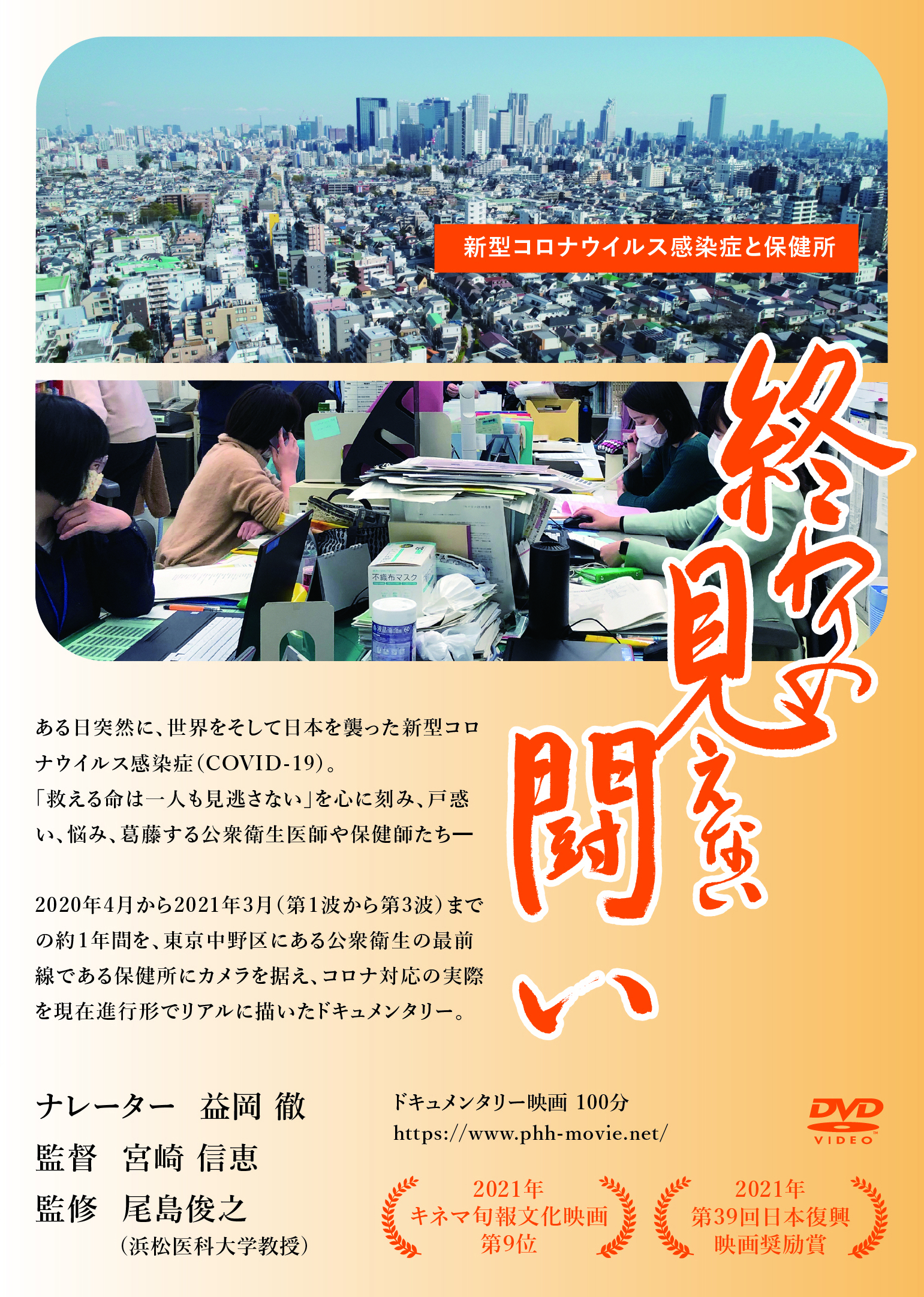 公衆衛生の最前線として新型コロナウイルス感染症の拡大防止に重要な役割を担う保健所 しかし、増え続ける感染者に保健所の業務はひっ迫。 施設でのクラスターは後を絶たず、病院のベッドも足りない。 いつ終息するのか見通しもつかない中「救える命は一人も見逃さない」と、保健所職員たちの 奮闘は続くー ![]() 本格的な冬の到来と歩調を併せるように新型コロナウイルス感染症の患者が急増。 命の選別や医療崩壊という言葉が毎日取り交わされ、医療機関のひっ迫が私たちの不安を大きくしています。そうした中で対応に追われる保健所はまた戦場さながらの状態になっています。しかし、保健所が新型コロナウイルス感染拡大防止にどのような役割を果たしているのか、その姿は余り目に触れることはなく、多くの人には知られていません。 この映画は新型コロナウイルス感染症が私たちの生活を一変させた2020年初夏から2021年3月までの約10ヶ月間を、公衆衛生の最前線である保健所にカメラを捉え、感染拡大防止にあたる保健師や他の保健所職員たちの奮闘と葛藤、苦悩をドキュメンタリーで描く中で、保健所の役割と今日的課題をみていきます。助成:文化庁文化芸術振興費補助金 (映画創造活動支援事業) 独立行政法人日本芸術文化振興会 ★対象★ 施設で働く職員の研修に、大学・看護専門学校で看護師・保健師を学ぶ教職員、学生の理解促進に 一般の人々への啓発に職場で、学校で、地域でお役立てください。 |